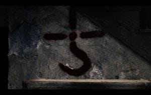 Sam and Dean check out the abandoned house, finding that their EMF doesn’t work because the house wiring still has some juice in it. Inside it’s dark, outside cloudy and threatening looking, and the house is a creepy set that looks as spooky as it’s supposed to. There are symbols painted on the walls.