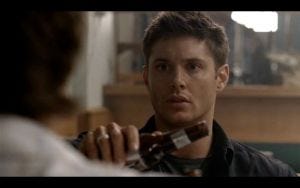 When Dean lifts his, his hand sticks to the beer bottle and Sam laughs.