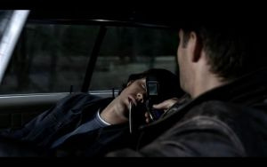 Cut to the Winchesters on the road, rock music playing, Sam asleep in the passenger seat. This is the episode where Sam and Dean are having an escalating prank war, so Dean slips a plastic spoon in Sam’s mouth, pulls out his flip phone and takes a picture, grinning happily after.