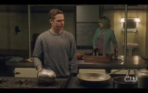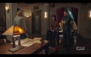Back at the bunker, it’s Winchester Game Night. Dean is fixing his favorite childhood game, Mousetrap (aww), Jack is making Jiffy Pop on the stove and Mary’s got the beers. Sammy’s out picking up the pepperoni meat intensive pizzas and one with pineapple for Jack, over Dean’s objections. It’s a nice domestic scene which means things are about to go south in a big way.