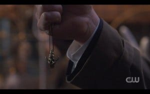 They’re just about to leave when Castiel sees something familiar – to us as well as to him. It’s the Samulet – not the real one, I presume, because the Winchesters have that. But this one looks mostly the same, and Methusaleh says that Joshua forged it after the angels fell to try to talk to God. Castiel gives it a try.