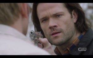 When Mary tells Sam about the angel grace syringe, he gets Nick at gunpoint and demands to know what’s going on. (Dean isn’t the only Winchester who’s scary when he’s pissed, btw)
