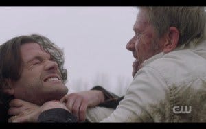 Jared, Jensen and Mark Pellegrino were all amazing in both scenes, the fights horribly believable so you could feel every blow. Sam gets the upper hand and pins Nick, choking him almost to death (and everyone watching was cheering him on, I have no doubt).