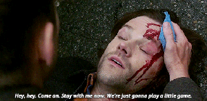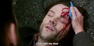 Jensen and Jared break my heart in a million pieces in this scene as Dean tries to keep Sam conscious, asking him to play a counting game. I wonder how many times they played a similar game as kids, big brother Dean trying to distract Sam from something frightening or painful….oh my heart.
