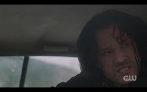 I literally gasped and screamed at that. And Jared then gave a masterful performance as Sam staggers, clearly having endured significant head trauma. Nick throws him against the car, hitting his head again, and Sam goes down. Nick chokes him, clearly not planning to stop – it’s only by managing to get into the Impala that Sam isn’t killed right then and there. He knows he’s in bad shape though, clearly – desperate, he uses Baby to call for help from Dean, hitting her horn.