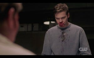 Nick goads Jack just as effectively as he has the others, until Jack snaps and head butts him, getting a bloody nose in the process. Why he did that and didn’t just hit him, I have no clue. Seems like an ouchy thing to do. Nick looks down pointedly at the blood on his shirt and uh oh…