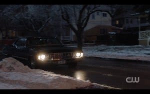 I guess Nick refused to tell them where Donatello is and will only show them, because Sam and Dean load him into the back seat of the Impala and head out to a deserted warehouse. This too is clearly a very bad idea but the Impala is beautiful driving through the snow covered Vancouver landscape – a rarity for British Columbia and hence for the show.